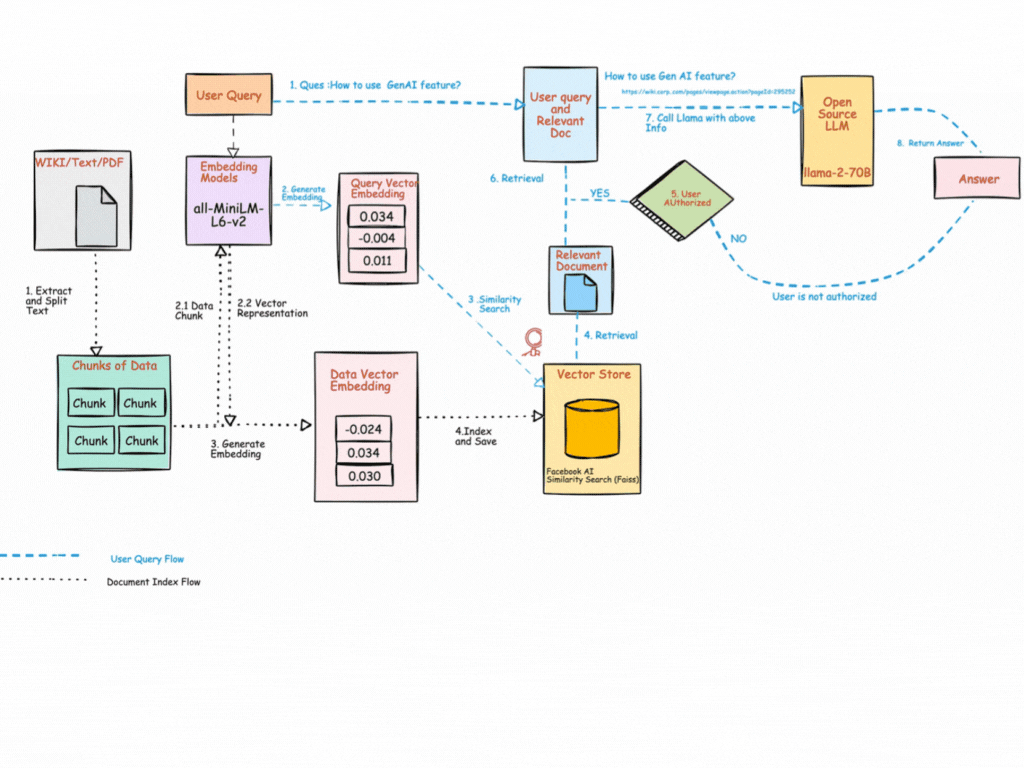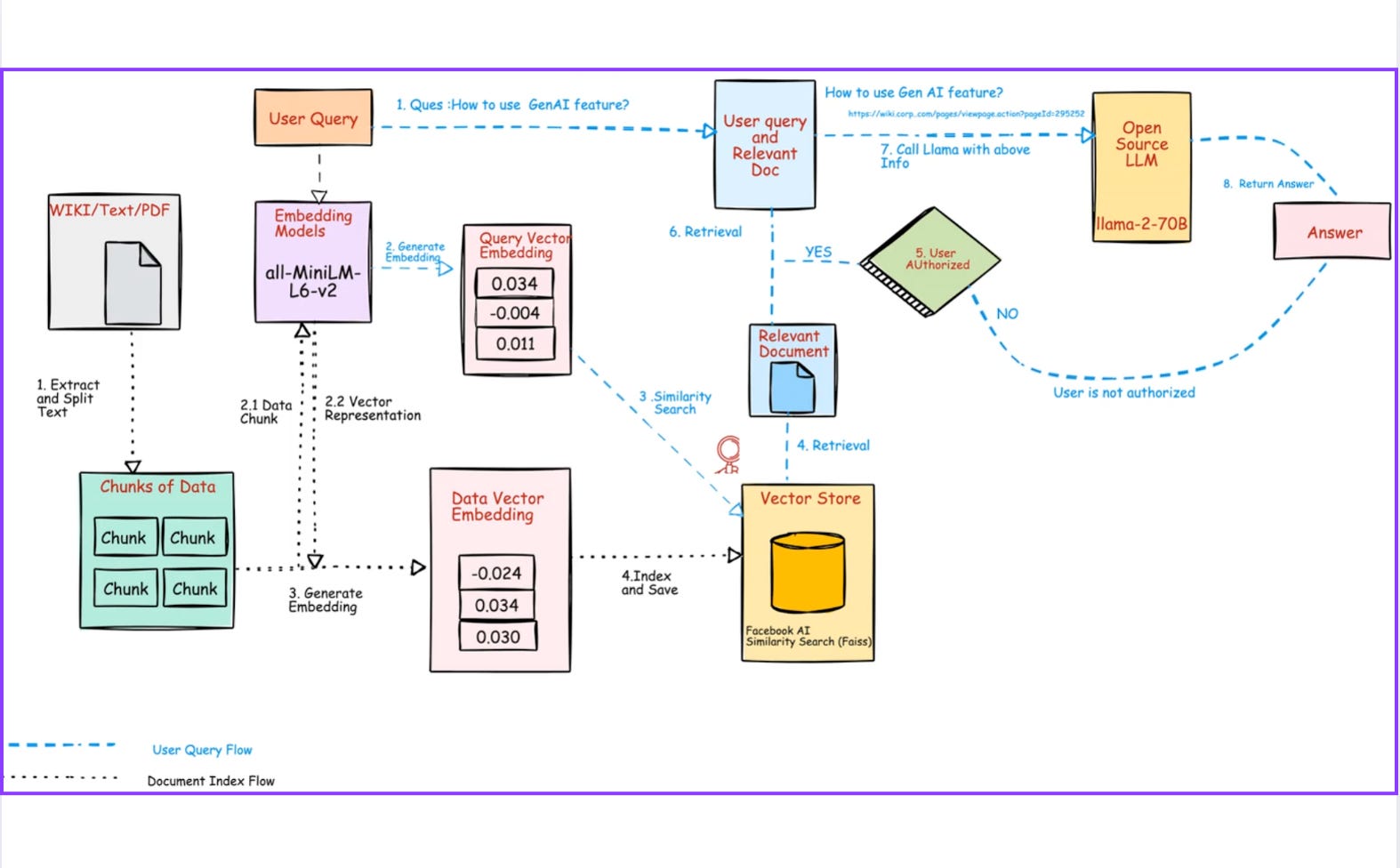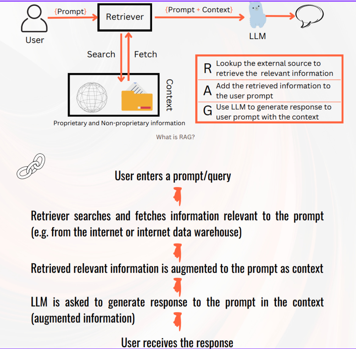 First, it retrieves relevant information from your own data (docs, PDFs, FAQs, knowledge bases).Then, it augments the userâs question with that information and sends it to a Large Language Model (LLM).Finally, the model generates an answer that is grounded in your data, not just in its pretraining.
